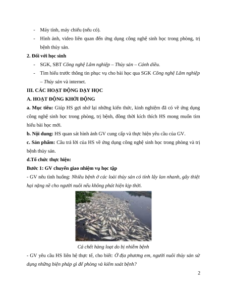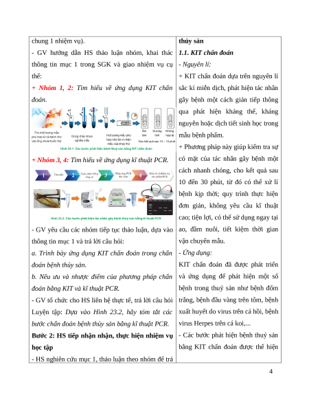 - GV chia lớp thành 4 nhóm (2 nhóm thực hiện sinh học trong chẩn đoán bệnh 3 chung 1 nhiệm vụ). thủy sản
