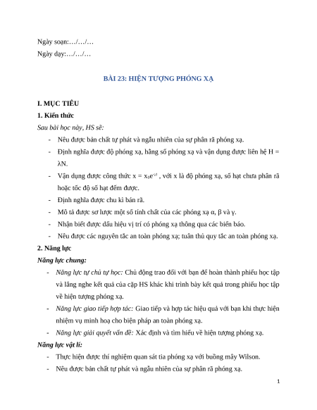 BÀI 23: HIỆN TƯỢNG PHÓNG XẠ I. MỤC TIÊU 1. Kiến thức