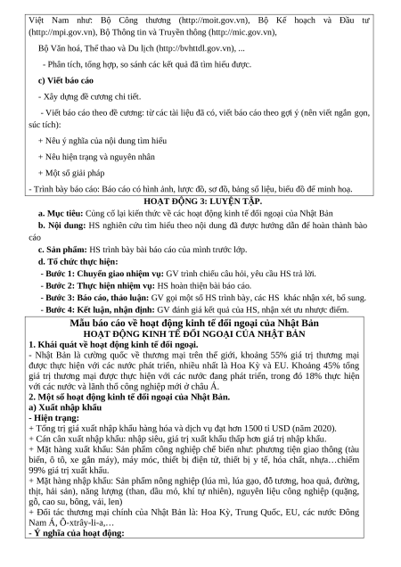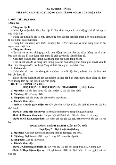 VIẾT BÁO CÁO VỀ HOẠT ĐỘNG KINH TẾ ĐỐI NGOẠI CỦA NHẬT BẢN I. MỤC TIÊU DẠY HỌC 1.Năng lực - Năng lực địa lí: