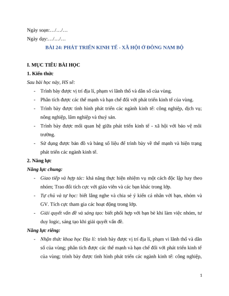 Giáo án Bài 24 Địa lí 12 Cánh diều: Phát triển kinh tế - xã hội ở Đông Nam Bộ