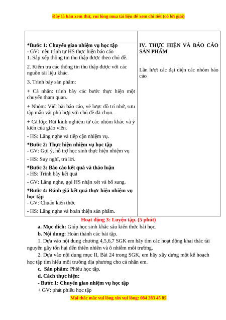 c. Sản phẩm: Thuyết trình sản phẩm, câu trả lời, bài làm của học sinh d. Cách thực hiện: HĐ của GV và HS
