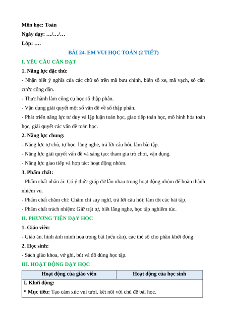 Giáo án Bài 24: Em vui học toán Toán lớp 5 Cánh diều