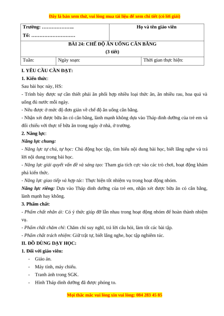 BÀI 24: CHẾ ĐỘ ĂN UỐNG CÂN BẰNG (3 tiết) Tuần: Ngày soạn: Thời gian thực hiện: I. YÊU CẦU CẦN ĐẠT: 1. Kiến thức: Sau bài học này, HS: