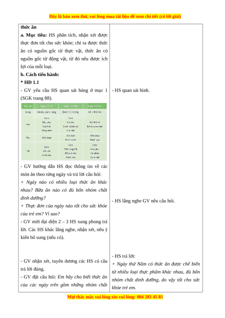 - GV nhận xét, tuyên dương các HS có câu + Ngày thứ Năm có thức ăn được chế biến trả lời đúng.