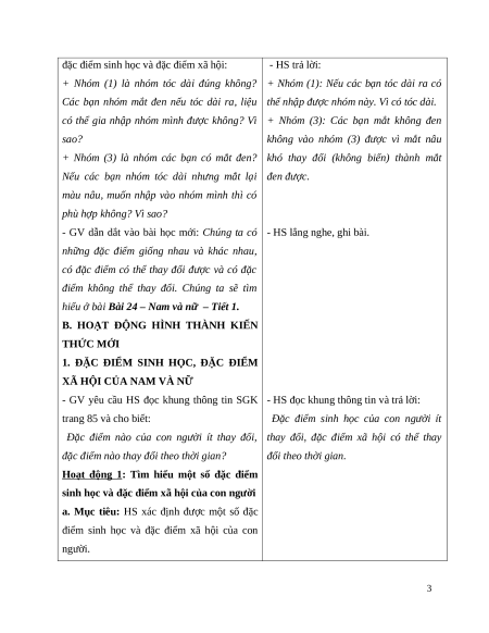 giao, liệt kê đặc điểm sinh học, đặc điểm xã hội của nam, nữ, của bản thân;