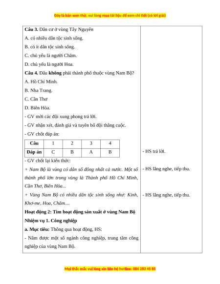 Câu 4. Đâu không phải thành phố thuộc vùng Nam Bộ? A. Hồ Chí Minh. B. Nha Trang. C. Cần Thơ D. Biên Hòa.