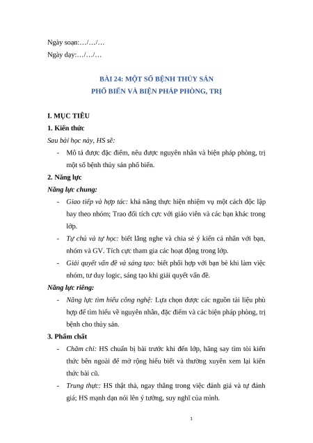 Giáo án Bài 24: Một số bệnh thuỷ sản phổ biến và biện pháp phòng, trị Công nghệ 12 Kết nối tri thức
