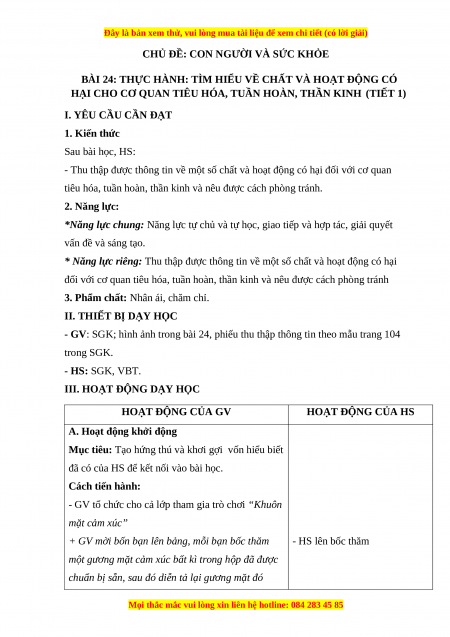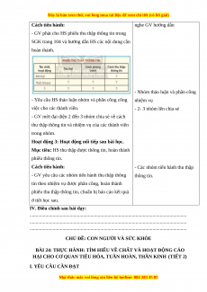 Giáo án Bài 24: Thực hành: Tìm hiểu về chất và hoạt động có hại cho cơ quan tiêu hóa, tuần hoàn, thần kinh Tự nhiên và xã hội lớp 3 Chân trời sáng tạo
