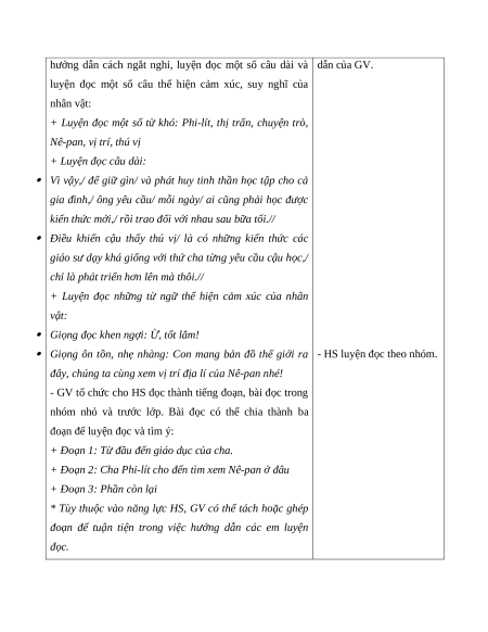 hướng dẫn cách ngắt nghỉ, luyện đọc một số câu dài và dẫn của GV.