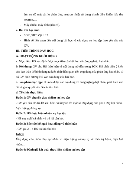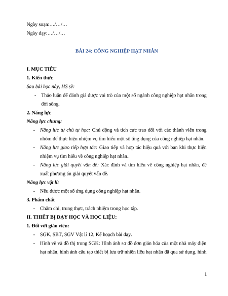 - Thảo luận để đánh giá được vai trò của một số ngành công nghiệp hạt nhân trong đời sống. 2. Năng lực