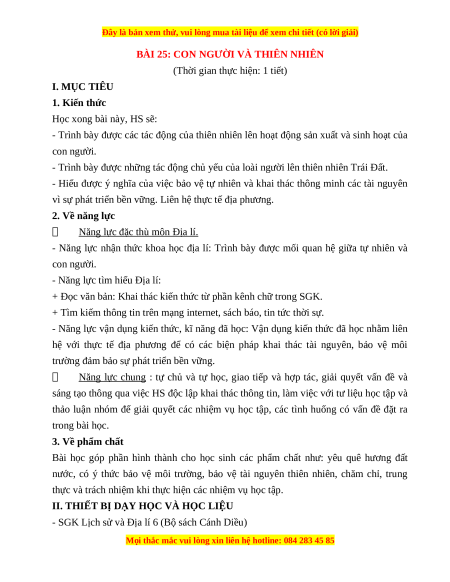 Giáo án Bài 25 Địa lí 6 Cánh diều (2024): Con người và thiên nhiên