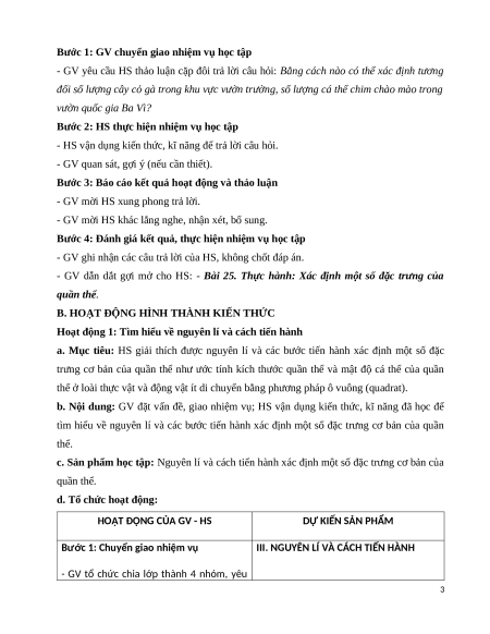 BÀI 25: THỰC HÀNH: XÁC ĐỊNH MỘT SỐ ĐẶC TRƯNG CỦA QUẦN THỂ I. MỤC TIÊU 1. Kiến thức Sau bài học này, HS sẽ:
