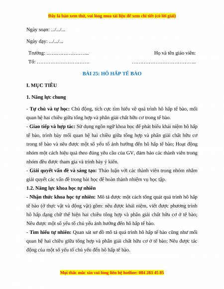 BÀI 25: HÔ HẤP TẾ BÀO I. MỤC TIÊU 1. Năng lực chung