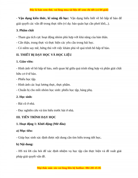 - Vận dụng kiến thức, kĩ năng đã học: Vận dụng hiểu biết về hô hấp tế bào để