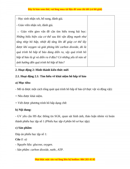 2.1. Hoạt động 2.1: Tìm hiểu về khái niệm hô hấp tế bào a) Mục tiêu: