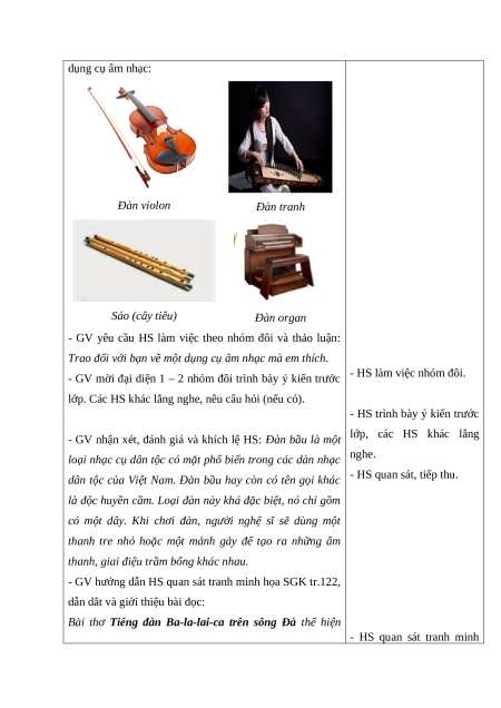 - GV trình chiếu cho HS quan sát một số hình ảnh về dụng cụ âm nhạc: Đàn violon Đàn tranh Sáo (cây tiêu) Đàn organ