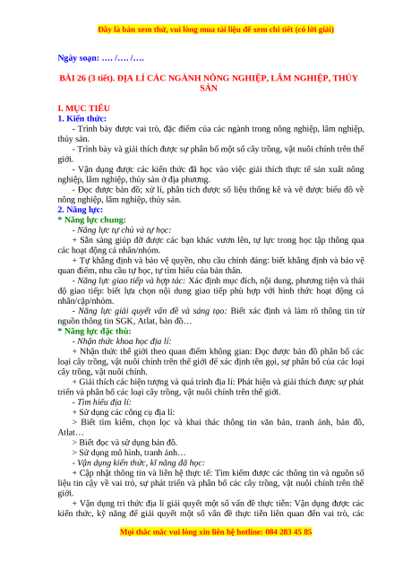 BÀI 26 (3 tiết). ĐỊA LÍ CÁC NGÀNH NÔNG NGHIỆP, LÂM NGHIỆP, THỦY SẢN I. MỤC TIÊU 1. Kiến thức: