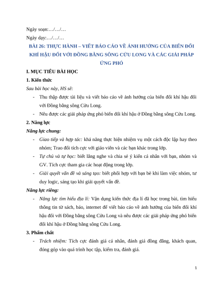 - Nêu được các giải pháp ứng phó biến đổi khí hậu ở Đồng bằng sông Cửu Long. 2. Năng lực