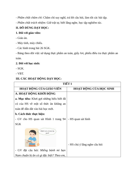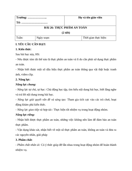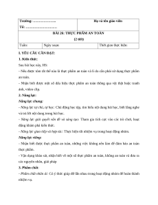 BÀI 26: THỰC PHẨM AN TOÀN (2 tiết) Tuần: Ngày soạn: Thời gian thực hiện: