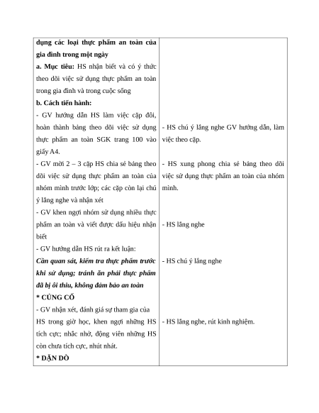 - Nhận biết được thực phẩm an toàn, những việc không nên làm để đảm bảo an toàn thực phẩm.