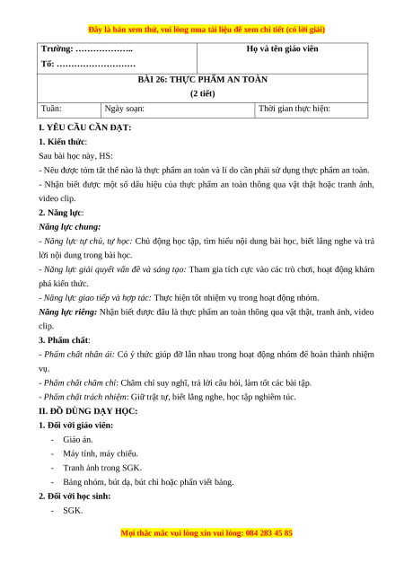 BÀI 26: THỰC PHẨM AN TOÀN (2 tiết) Tuần: Ngày soạn: Thời gian thực hiện: I. YÊU CẦU CẦN ĐẠT: 1. Kiến thức: Sau bài học này, HS: