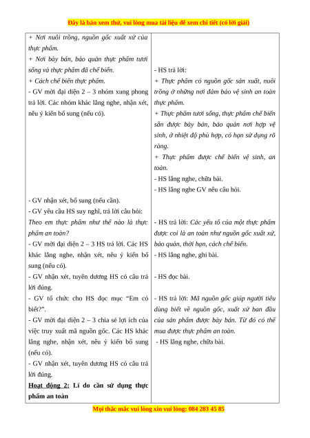 lời. Các HS khác lắng nghe, nhận xét, nêu ý sử dụng để chế biến thức ăn an toàn vì