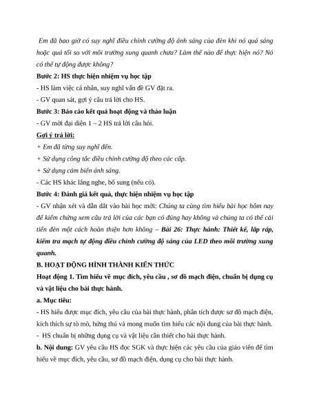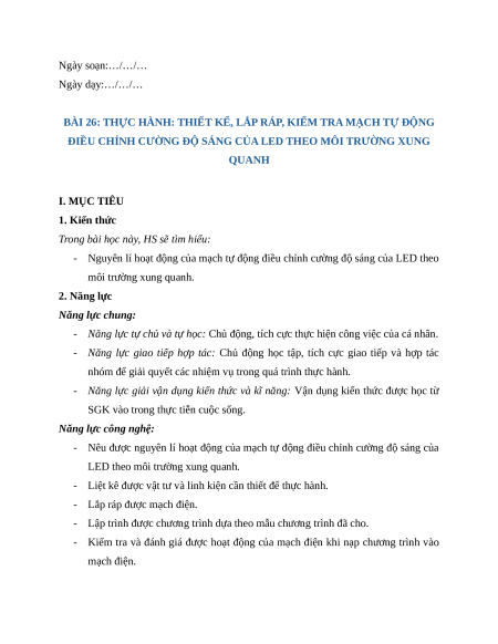 ĐIỀU CHỈNH CƯỜNG ĐỘ SÁNG CỦA LED THEO MÔI TRƯỜNG XUNG QUANH I. MỤC TIÊU 1. Kiến thức