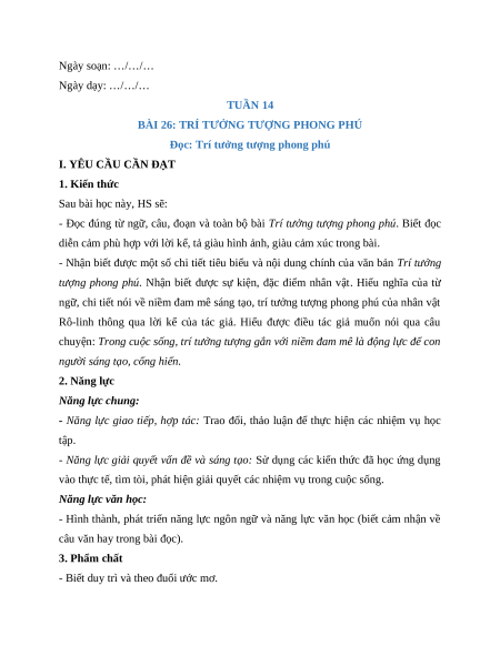 - Đọc đúng từ ngữ, câu, đoạn và toàn bộ bài Trí tưởng tượng phong phú. Biết đọc