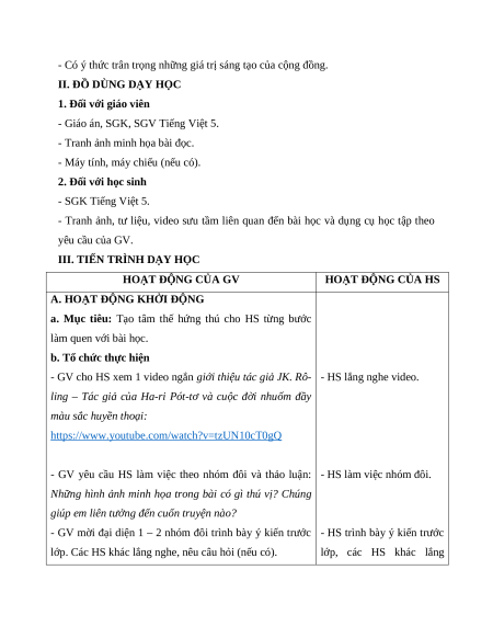 - GV cho HS xem 1 video ngắn giới thiệu tác giả JK. Rô- - HS lắng nghe video.