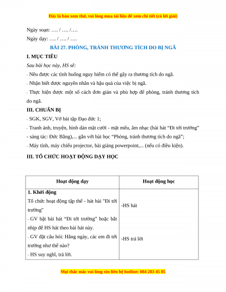 Giáo án Bài 27 Đạo đức 1 Kết nối tri thức: Phòng, tránh thương tích do ngã