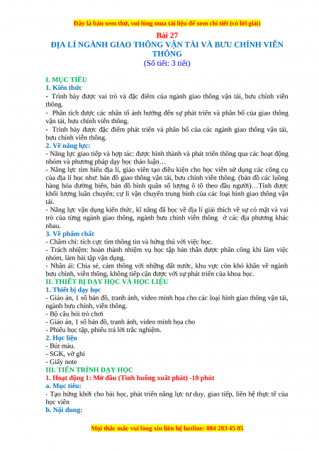 ĐỊA LÍ NGÀNH GIAO THÔNG VẬN TẢI VÀ BƯU CHÍNH VIỄN THÔNG (Số tiết: 3 tiết) I. MỤC TIÊU 1. Kiến thức