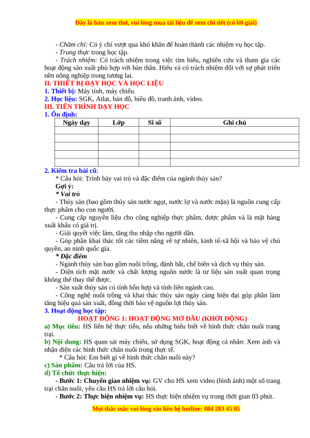 * Câu hỏi: Trình bày vai trò và đặc điểm của ngành thủy sản? Gợi ý: * Vai trò