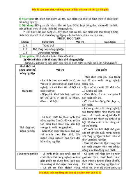 hình thức tổ chức lãnh thổ nông nghiệp qua hoàn thành phiếu học tập sau: