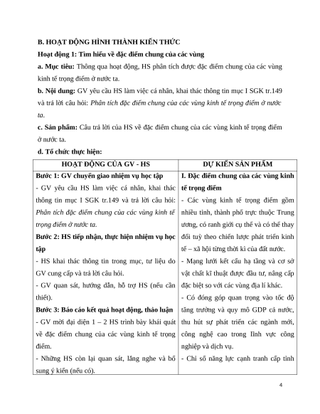 c. Sản phẩm: Câu trả lời của HS về đặc điểm chung của các vùng kinh tế trọng điểm ở nước ta.