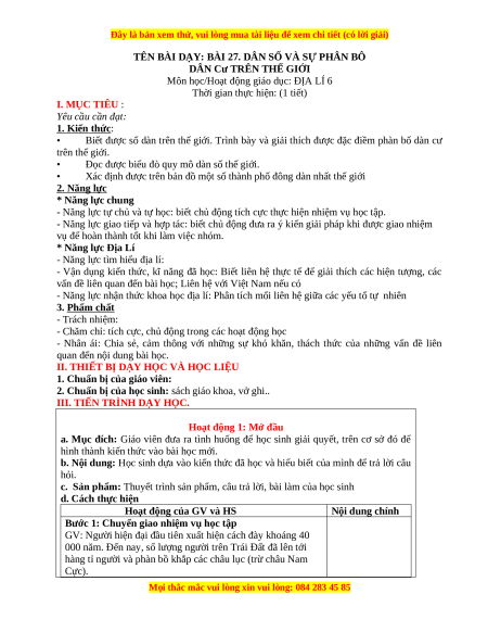 Giáo án Bài 27 Địa lí 6 Kết nối tri thức (2024): Dân số và sự phân bố dân cư trên thế giới