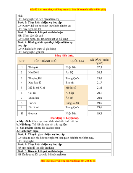 GV: Chuẩn kiến thức và ghi bảng HS: Lắng nghe, ghi bài Bảng kiến thức. STT TÉN THÀNH PHÔ QUÔC GIA SÔ DÂN (Triệu người) 1 Tô-ky-ô Nhật Bản 37,5 2 Niu Đê-li Án Độ 28,5 3 Thượng Hải Trung Quốc 25,6 4 Xao Pao-lô Bra-xin 21,7 5 Mê-hi-cô Xi-ti Mê-hi-cô 21,6 6 Cai-rô Ai Cập 20,1 7 Mum-bai Án Độ 20,0 8 Đắc-ca Băng-la-đét 19,6 9 Bắc Kinh Trung Quốc 19,6 10 ồ-xa-ca Nhật Bàn 19,3