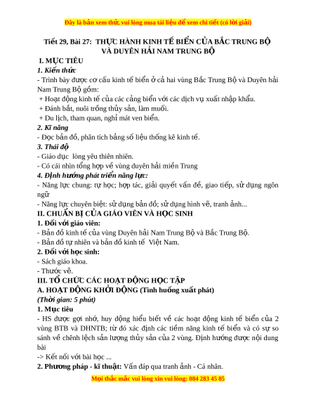 Đây là bản xem th , vu ử i lòng mua tài li u ệ đ xe ể m chi ti t (c ế ó l i ờ gi i ả ) Ti t ế 29, Bài 27: TH C Ự HÀNH KINH T B Ế I N Ể C A Ủ B C Ắ TRUNG B Ộ VÀ DUYÊN H I Ả NAM TRUNG BỘ I. M C Ụ TIÊU 1. Ki n ế th c ứ - Trình bày đư c ợ cơ c u ấ kinh t ế bi n ể ở c ả hai vùng B c ắ Trung B ộ và Duyên h i ả Nam Trung Bộ gồm: + Ho t ạ đ ng ki ộ nh t c ế a các ủ c ng ả bi n v ể i ớ các d ch v ị xu ụ t ấ nh p ậ kh u. ẩ + Đánh b t ắ , nuôi tr ng t ồ h y s ủ n, l ả àm mu i ố . + Du l ch, t ị ham quan, ngh m ỉ át ven bi n. ể 2. Kĩ năng - Đ c b ọ n ả đ , phân t ồ ích b ng s ả l ố i u t ệ h ng kê ki ố nh t . ế 3. Thái độ - Giáo d c l ụ òng yêu thiên nhiên. - Có cái nhìn tổng h p v ợ vùng duyên ề h i ả mi n ề Trung 4. Đ nh h ị ư ng phát ớ tri n năng l ể c: ự - Năng l c ự chung: tự h c; ọ h p ợ tác, gi i ả quy t ế v n ấ đ , ề giao ti p, ế sử d ng ụ ngôn ngữ - Năng l c chuyên ự bi t ệ : sử d ng b ụ n ả đ ; ồ s d ử ng hì ụ nh v , t ẽ ranh nh... ả II. CHUẨN BỊ C A Ủ GIÁO VIÊN VÀ H C Ọ SINH 1. Đ i ố v i ớ giáo viên: - B n ả đồ kinh t c ế a ủ vùng Duyên h i ả Nam Trung B và B ộ c ắ Trung B . ộ - B n