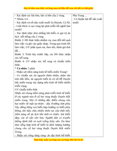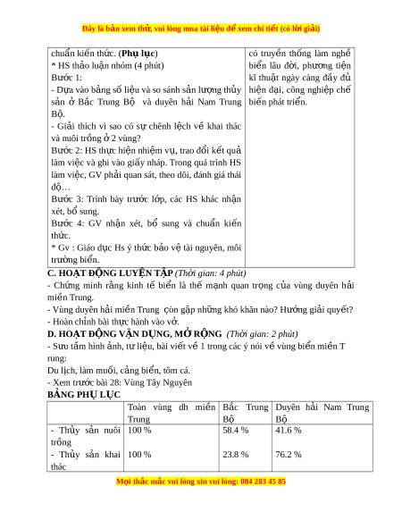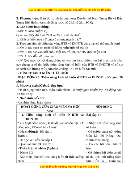 Đây là bản xem th , vu ử i lòng mua tài li u ệ đ xe ể m chi ti t (c ế ó l i ờ gi i ả ) 3. Phư ng ơ ti n: ệ B n ả đồ tự nhiên c a ủ vùng Duyên h i ả Nam Trung Bộ và B c ắ Trung B ( ộ Ho c h ặ c ọ sinh dùng lư c ợ đ 24.3 và ồ 26.1 SGK) 4. Các bư c ớ ho t ạ đ ng: ộ Bư c 1 ớ : Giao nhi m ệ v : ụ Quan sát lư c ợ đ