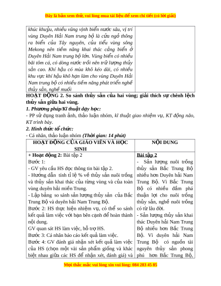ờ gian: 14 phút) HOẠT Đ N Ộ G C A Ủ GIÁO VIÊN VÀ H C Ọ N I Ộ DUNG SINH + Ho t ạ đ ng 2: ộ Bài t p ậ 2 Bài t p 2 ậ Bư c 1: ớ - S n ả lư ng ợ nuôi tr ng ồ - GV yêu cầu HS đ c t ọ hông tin bài t p 2. ậ th y ủ s n ả B c ắ Trung Bộ - Hư ng ớ d n ẫ tính tỉ lệ % v ề th y ủ s n ả nuôi tr ng ồ nhi u ề h n ơ Duyên h i ả Nam và th y ủ s n ả khai thác c a ủ t ng ừ vùng và c a ủ toàn Trung B . ộ Vì B c ắ Trung vùng duyên h i ả mi n ề Trung. Bộ có nhi u ề đ m ầ phá - L p ậ b ng ả so sánh s n ả lư ng ợ th y ủ s n ả c a ủ B c ắ thu n ậ l i ợ cho nuôi tr ng ồ Trung B và duyên h ộ i ả Nam Trung B . ộ th y ủ s n, ả nghề nuôi tr ng ồ Bư c ớ 2: HS th c ự hi n ệ nhi m ệ v , ụ có thể so sánh có t l ừ âu đ i ờ . k t ế quả làm vi c ệ v i ớ b n ạ bên c nh ạ đ ể hoàn thành - S n ả lư ng ợ th y ủ s n ả khai n i ộ dung. thác Duyên h i ả Nam Trung GV quan sát HS làm vi c, ệ h t ỗ r H ợ S. Bộ nhi u ề h n ơ B c ắ Trung Bư c 3: ớ Cá nhân báo cáo k t ế qu l ả àm vi c. ệ B . ộ Vì duyên h i ả Nam Bư c ớ 4: GV đánh giá nh n ậ xét k t ế quả làm vi c ệ Trung Bộ có ngu n ồ tài c a ủ HS (ch n ọ m t ộ vài s n ả ph m ẩ gi ng ố và khác nguyên th y ủ s n ả phong biệt nhau gi a ữ các HS để nh n