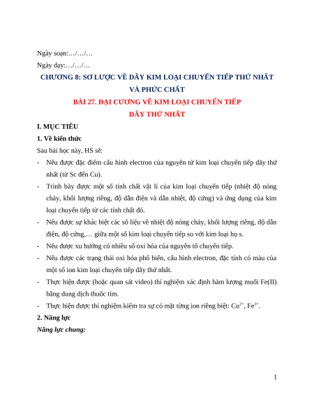 BÀI 27. ĐẠI CƯƠNG VỀ KIM LOẠI CHUYỂN TIẾP DÃY THỨ NHẤT I. MỤC TIÊU 1. Về kiến thức Sau bài học này, HS sẽ: