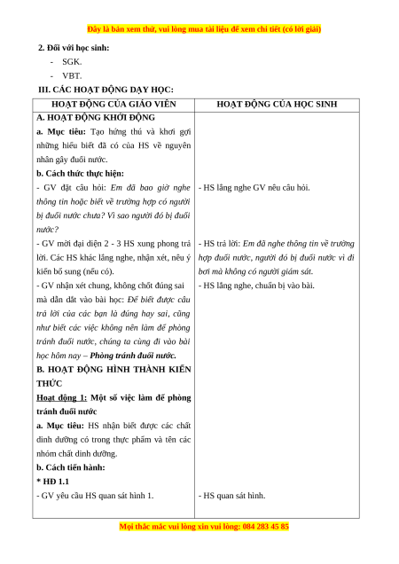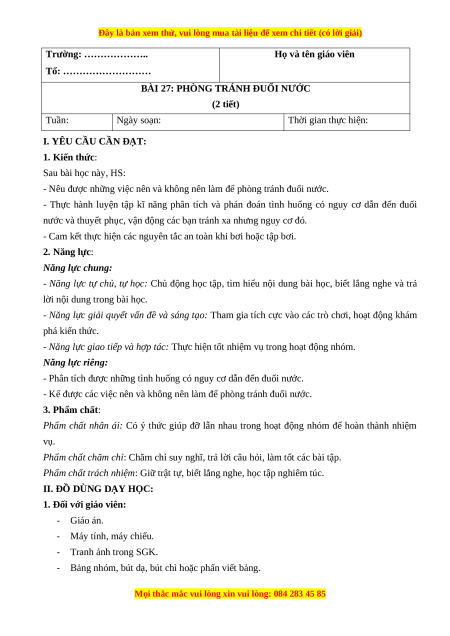 BÀI 27: PHÒNG TRÁNH ĐUỐI NƯỚC (2 tiết) Tuần: Ngày soạn: Thời gian thực hiện: I. YÊU CẦU CẦN ĐẠT: 1. Kiến thức: Sau bài học này, HS: