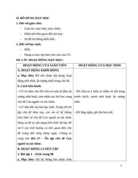 BÀI 27: ÔN TẬP CHỦ ĐỀ CON NGƯỜI VÀ SỨC KHỎE (1 tiết)