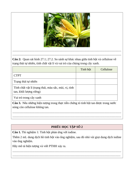 Câu 2: Quan sát hình 27.1; 27.2. So sánh sự khác nhau giữa tinh bột và cellulose về