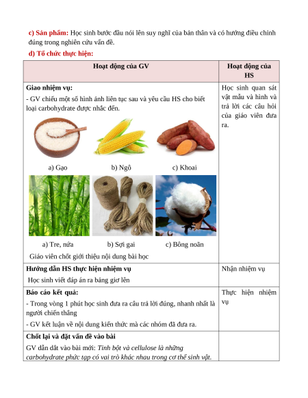 - Năng lực tìm hiểu tự nhiên: Nhận biết được tinh bột và cellulose trong tự