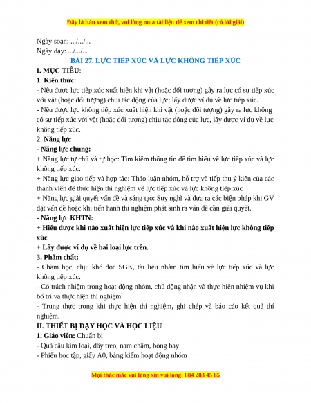 BÀI 27. LỰC TIẾP XÚC VÀ LỰC KHÔNG TIẾP XÚC I. MỤC TIÊU: 1. Kiến thức: