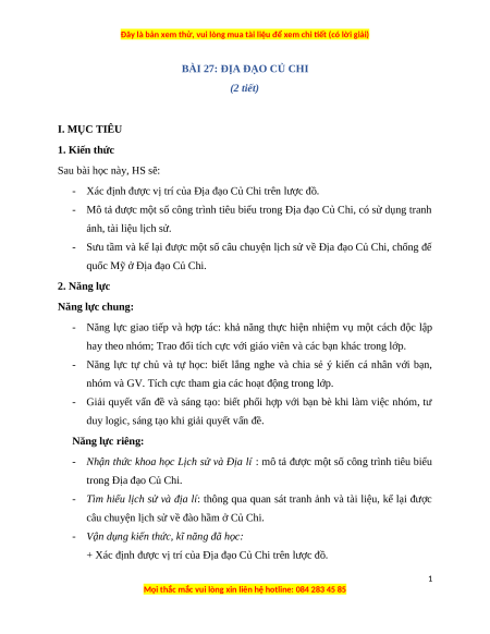 BÀI 27: ĐỊA ĐẠO CỦ CHI (2 tiết) I. MỤC TIÊU 1. Kiến thức Sau bài học này, HS sẽ: