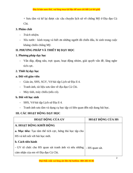 + Sưu tầm và kể lại được các câu chuyện lịch sử về chống Mỹ ở Địa đạo Củ Chi. 3. Phẩm chất - Trách nhiệm.