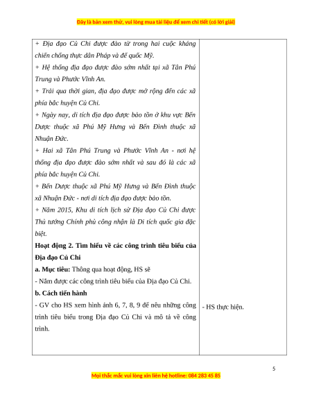 - Nhận thức khoa học Lịch sử và Địa lí : mô tả được một số công trình tiêu biểu trong Địa đạo Củ Chi.