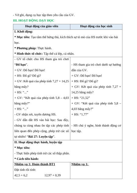 - Thực hiện được thành thạo phép cộng, phép trừ các số thập phân; tính giá trị biểu