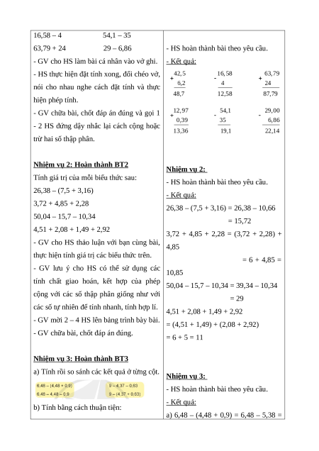 - HS hoàn thành bài theo yêu cầu. 26,38 – (7,5 + 3,16) - Kết quả: 3,72 + 4,85 + 2,28